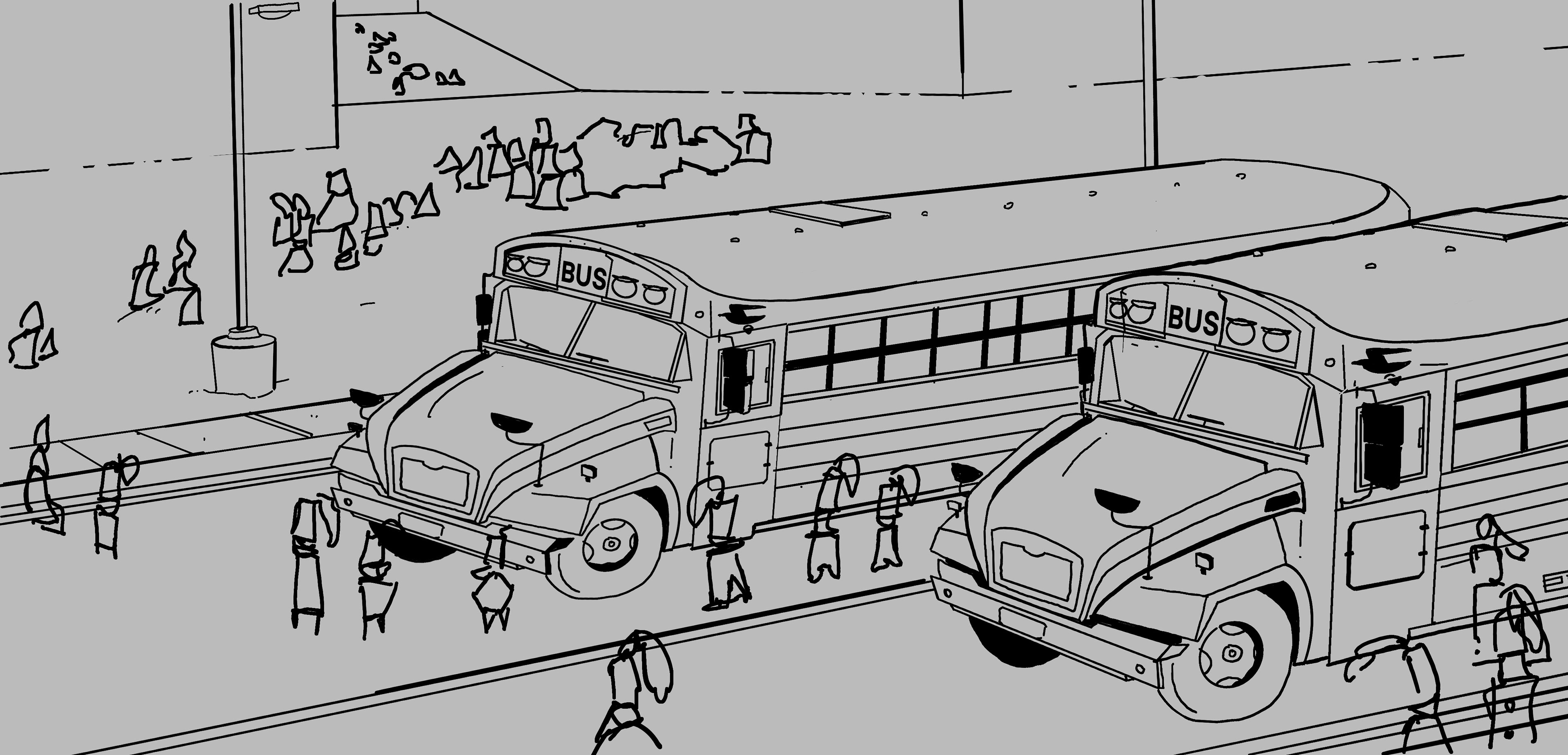 Environmental visdev exploring student buses arriving at a Texas football stadium at night.