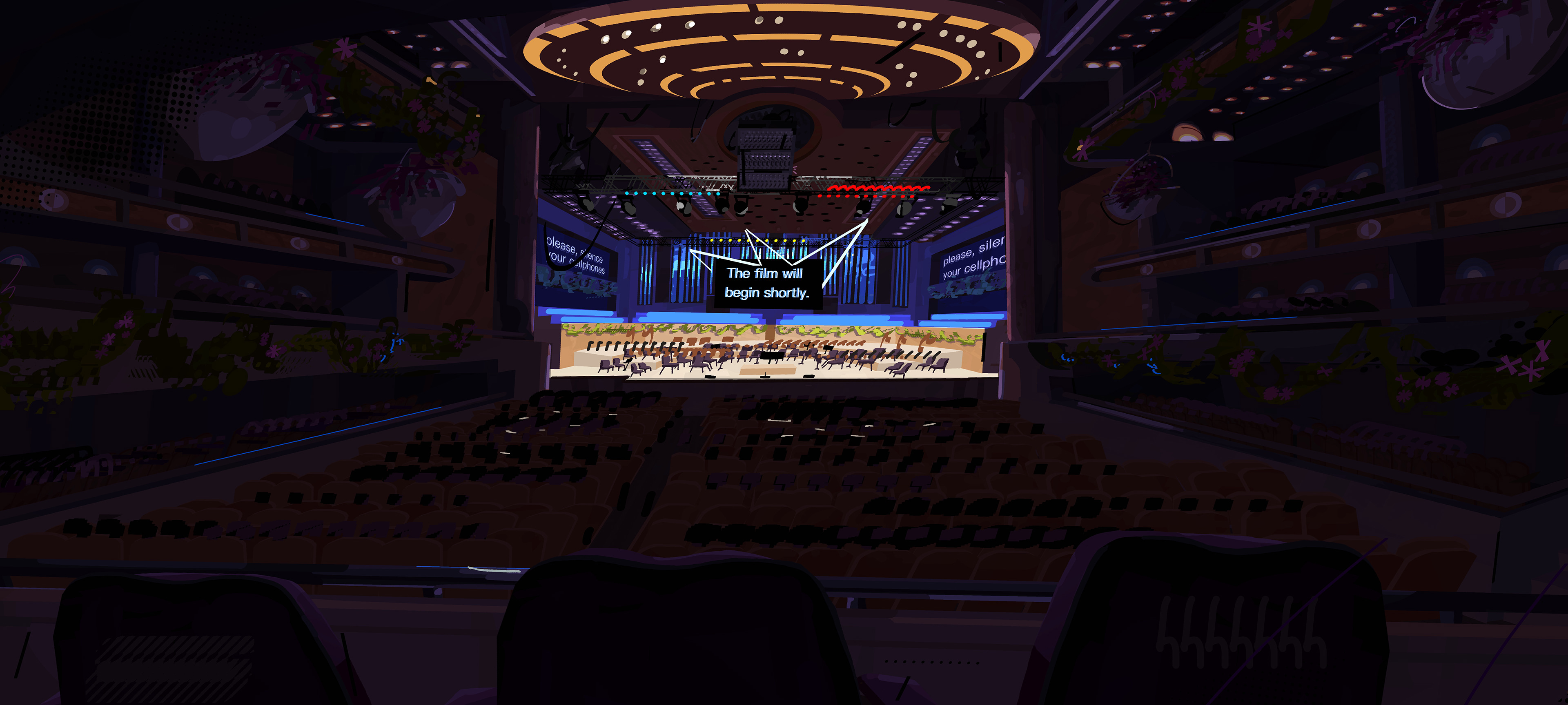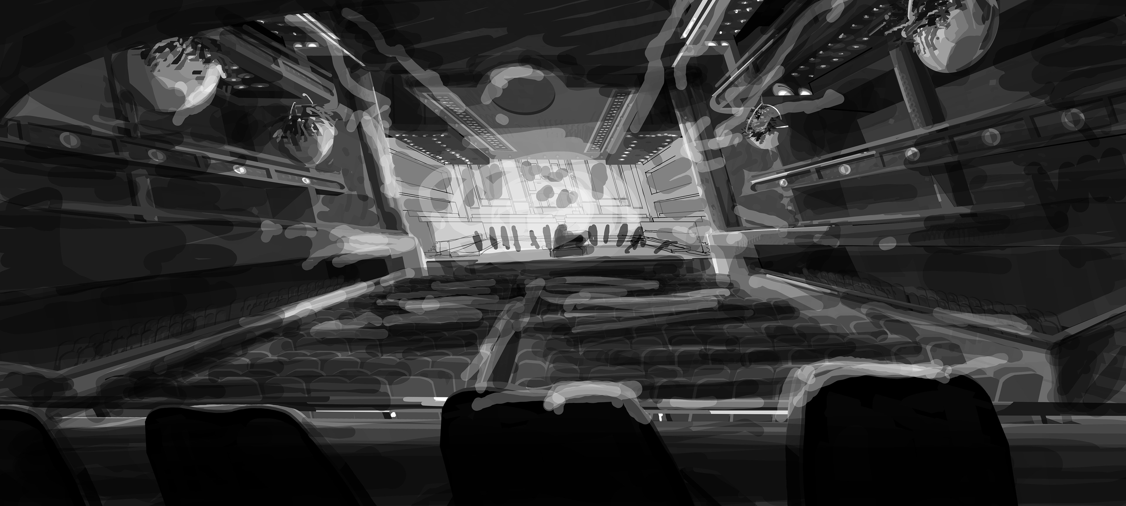 Props and environmental development exploring a heightened concert hall. Focus on mood and atmosphere.