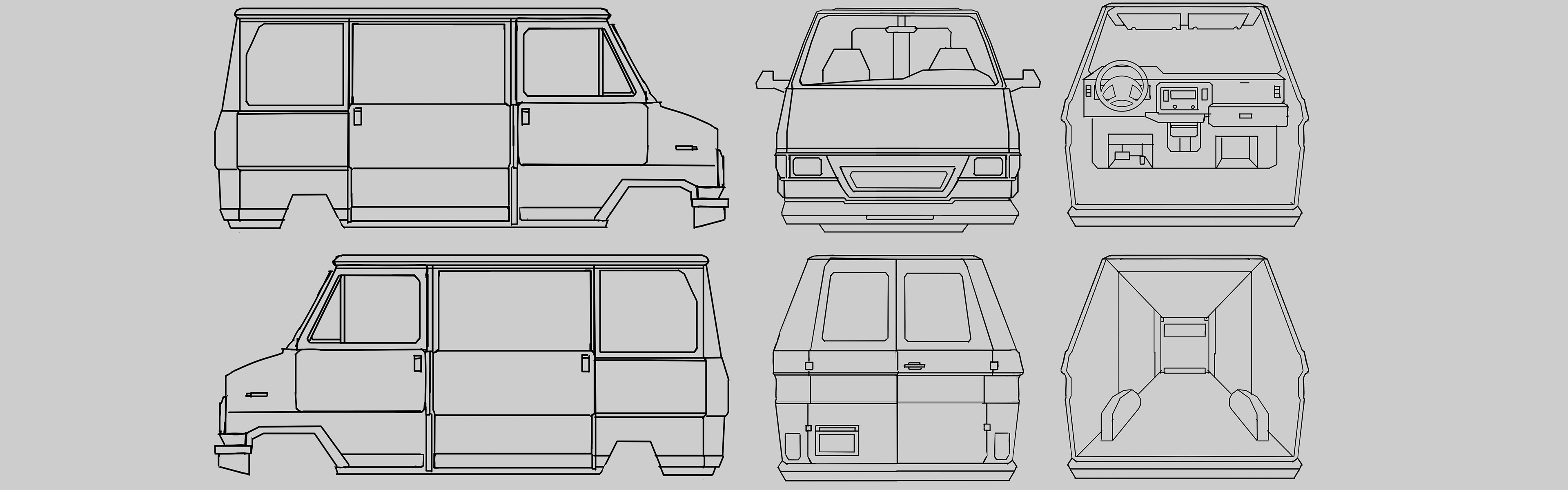 Prop development for a lived-in van. Attention given to real-world function, material aging, and narrative decals and modifications.